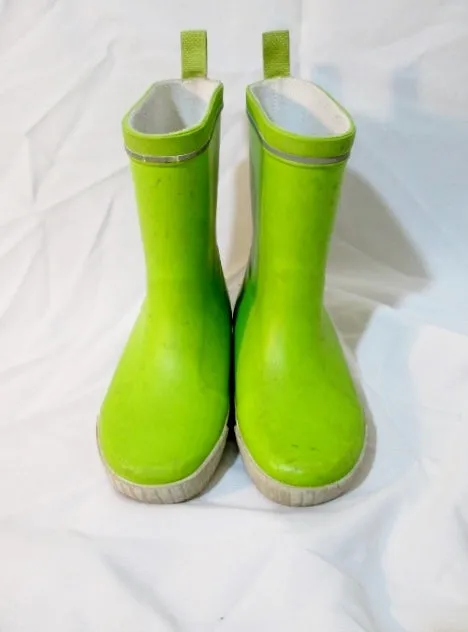 Awesome pair of toddler / little kids / girls / boys TRETORN CHARTREUSE YELLOW GREEN lined waterproof rubber rain boots / wellingtons / puddle jumpers / foul weather boots, size 2 / EU 33. Measures approximately 8 inches tall, 8.75" heel to toe, 3.5" wide. Some marks, wear as shown, bottom could use a cleaning, really cool design! Keep your little one's tootsies warm and dry this season!